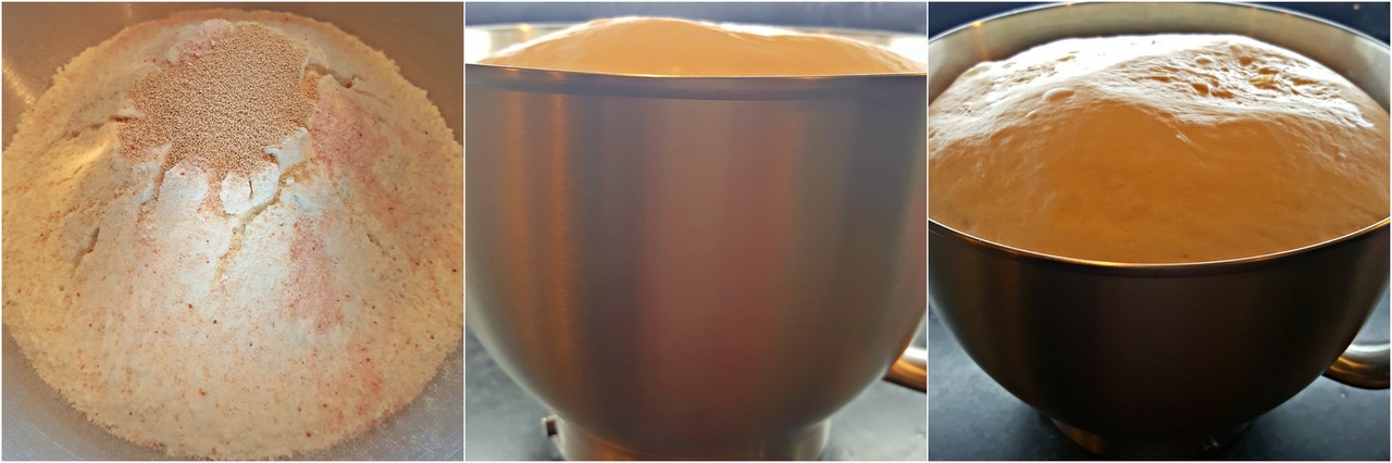 Започваме като първо пресяваме брашното, като към него добавяме маята и солта. В отделна купичка добавяме меда и зехтина към топлата вода (така че меда да се разтвори) и изсипваме към брашното. От тук започва месенето на тестото. Аз лично слагам всичко в миксера и го оставям да си меси на спокойствие. Ако пък ще го месите на ръка, то трябва да се получи меко тесто, което отнема около 10тина минути месене. След като сме готови покриваме купата със стреч фолио и я оставяме някъде на топло за около 1 час така че тестото да втаса и да удвои обема си.